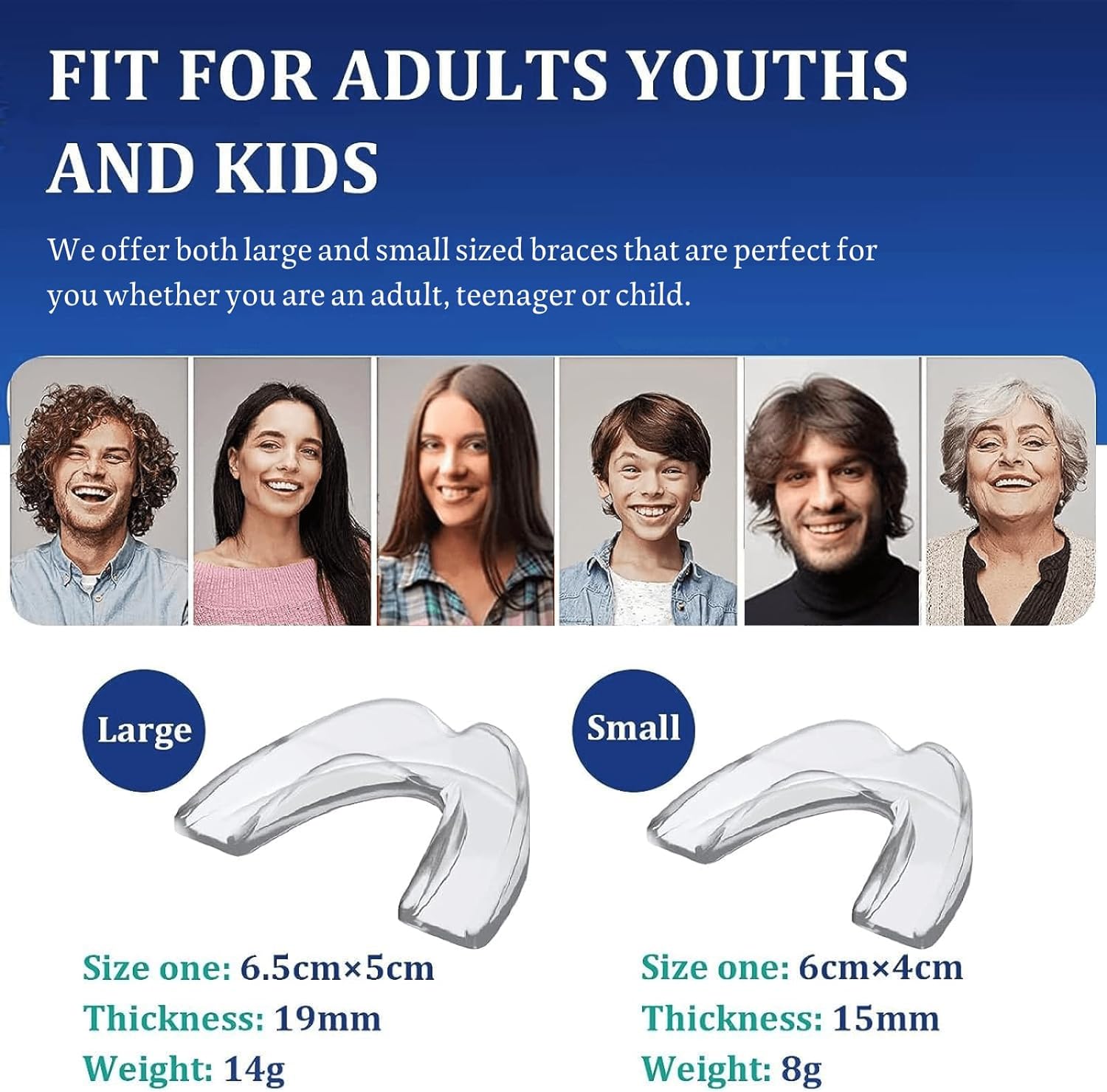 - ✅4 Pcack & 2 Sizes: Our night mouth guard set has a total of 4 mouthguards, 2 sizes, 2 large mouthguards, 2 small mouthguards, when you are not using the mouth guard for sleeping, you can store it in the tooth box for easy storage and safekeeping.